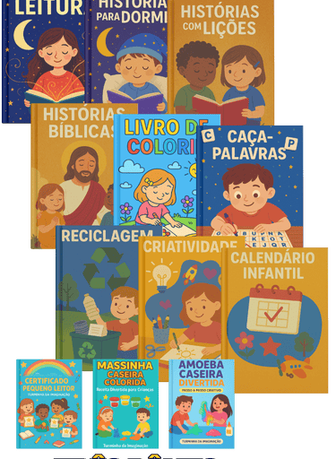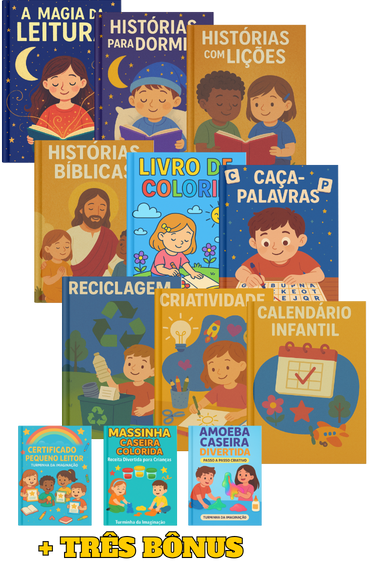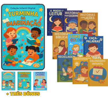 Coleção com 9 eBooks + 3 bônus criada para desenvolver a imaginação, criatividade, leitura e aprendizado das crianças de 3 a 8 anos, de forma leve, divertida e 100% digital.