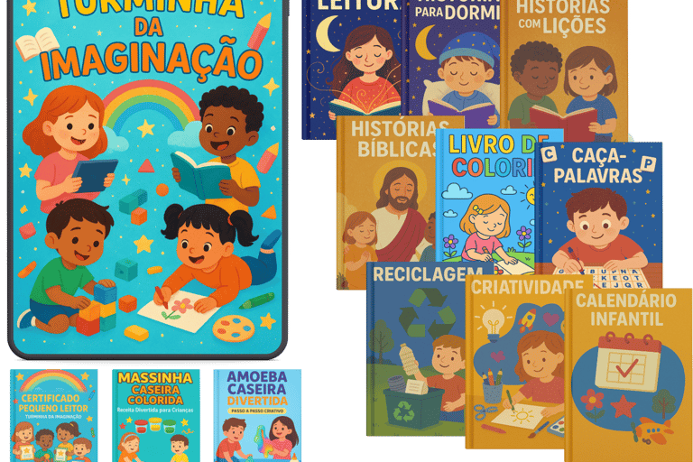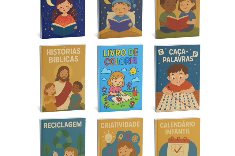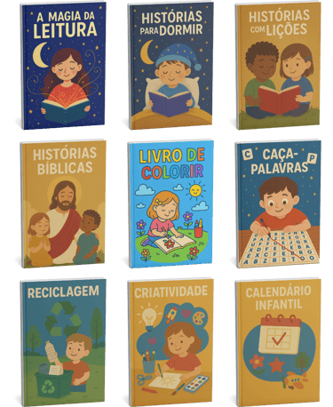São 9 eBooks e 3 bônus que estimulam leitura, criatividade e valores cristãos, tudo com ilustrações coloridas e atividades educativas.